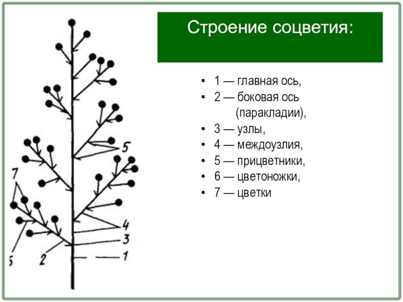 4 — простой зонтик, 5 - головка, 6 — корзинка, 7 — щиток (4. 5, 6 — с укороченной главной осью, прочие — с удлиненной);