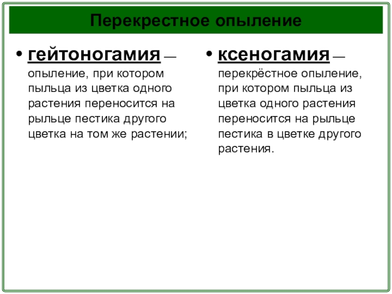 ксеногамия — перекрёстное опыление, при котором пыльца из цветка одного растения переносится на рыльце пестика в цветке другого растения.