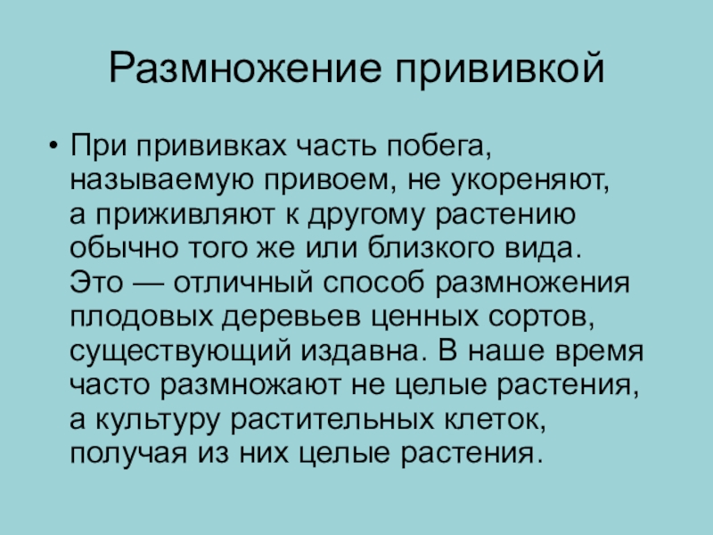 другому растению обычно того же или близкого вида. Это — отличный способ размножения плодовых деревьев ценных сортов, существующий издавна. В наше время часто размножают не целые растения, а культуру растительных клеток, получая из них целые растения.