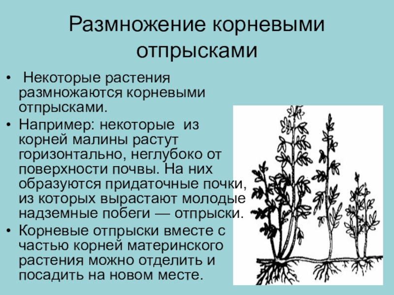 корней малины растут горизонтально, неглубоко от поверхности почвы. На них образуются придаточные почки, из которых вырастают молодые надземные побеги — отпрыски.