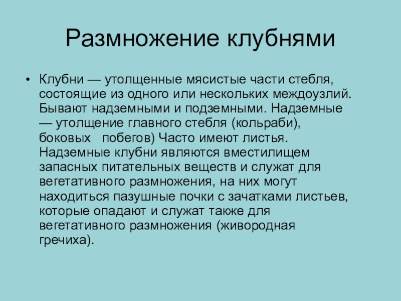 нескольких междоузлий. Бывают надземными и подземными. Надземные — утолщение главного стебля (кольраби), боковых побегов) Часто имеют листья. Надземные клубни являются вместилищем запасных питательных веществ и служат для вегетативного размножения, на них могут находиться пазушные почки с зачатками листьев, которые опадают и служат также для вегетативного размножения (живородная гречиха).