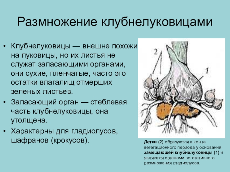 Детки (2) образуются в конце вегетационного периода у основания замещающей клубнелуковицы (1) и являются органами вегетативного размножения гладиолусов.