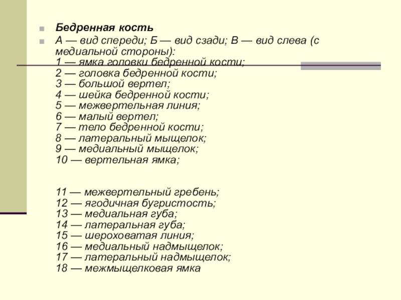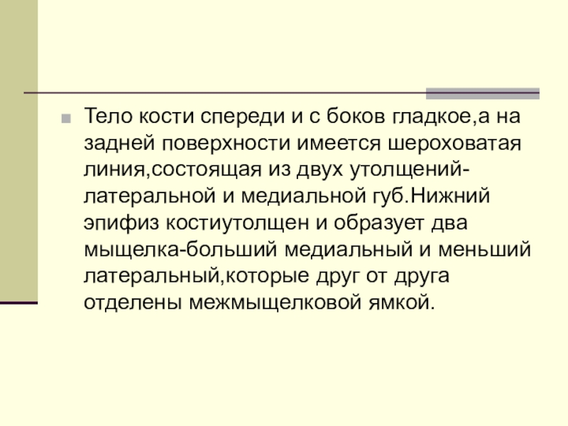 шероховатая линия,состоящая из двух утолщений-латеральной и медиальной губ.Нижний эпифиз костиутолщен и образует два мыщелка-больший медиальный и меньший латеральный,которые друг от друга отделены межмыщелковой ямкой.