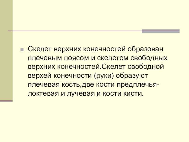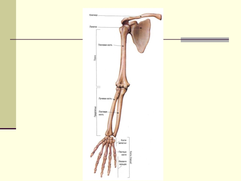свободной верхей конечности (руки) образуют плечевая кость,две кости предплечья-локтевая и лучевая и кости кисти.