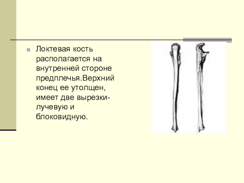 Слайд 13Локтевая кость располагается на внутренней стороне предплечья.Верхний конец ее утолщен,имеет две