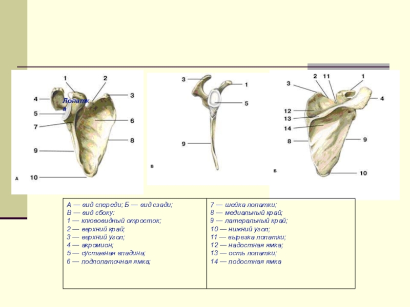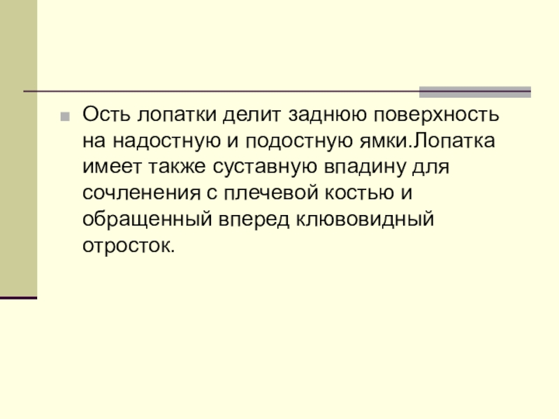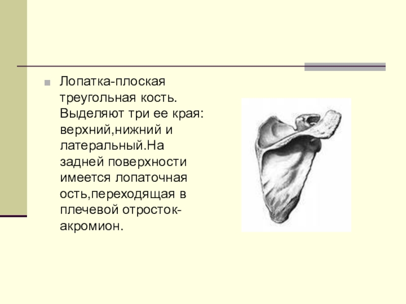 Слайд 6Лопатка-плоская треугольная кость.Выделяют три ее края:верхний,нижний и латеральный.На задней поверхности имеется