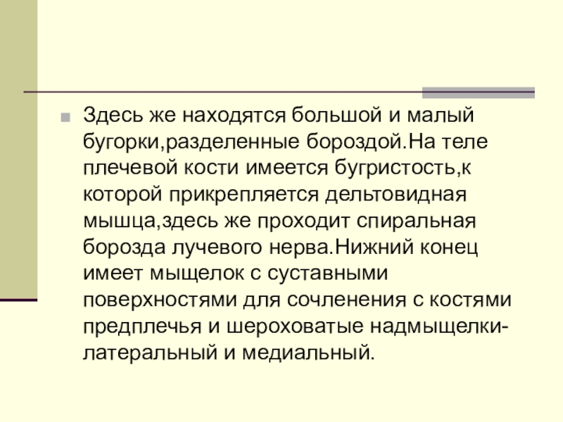 Слайд 11Здесь же находятся большой и малый бугорки,разделенные бороздой.На теле плечевой кости