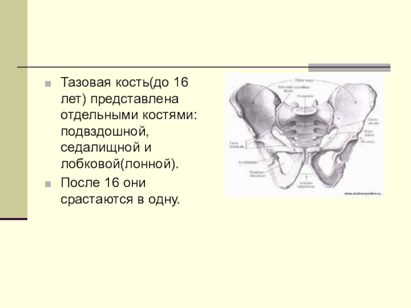 Слайд 23Тазовая кость(до 16 лет) представлена отдельными костями:подвздошной,седалищной и лобковой(лонной).