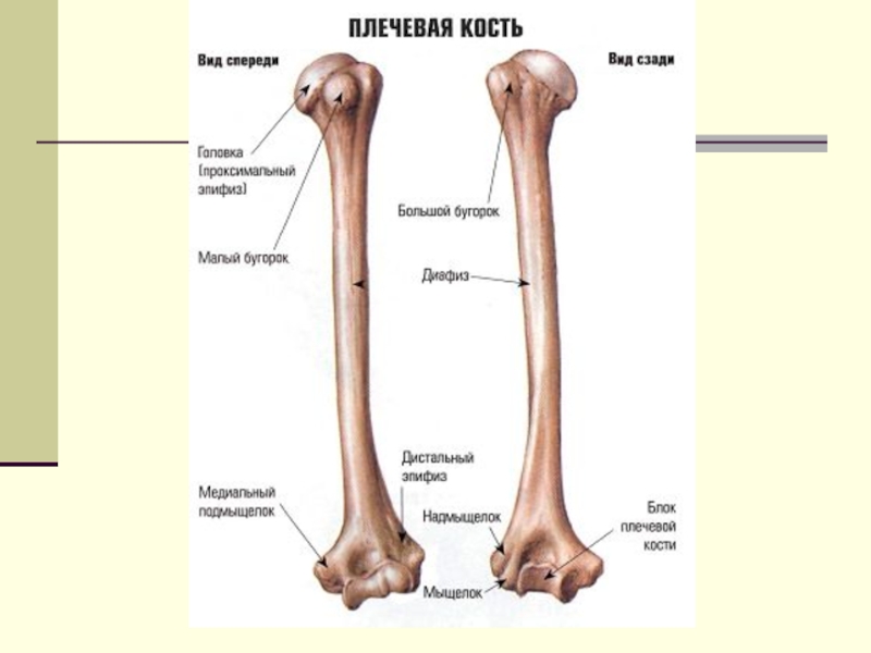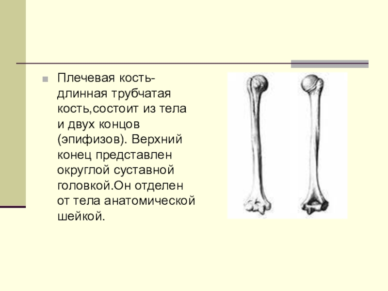Слайд 9Плечевая кость-длинная трубчатая кость,состоит из тела и двух концов(эпифизов). Верхний конец