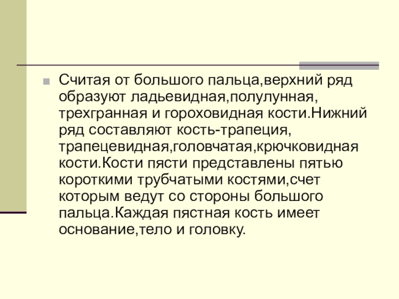 составляют кость-трапеция,трапецевидная,головчатая,крючковидная кости.Кости пясти представлены пятью короткими трубчатыми костями,счет которым ведут со стороны большого пальца.Каждая пястная кость имеет основание,тело и головку.