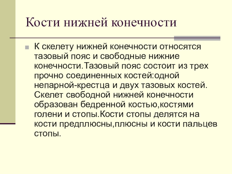 нижние конечности.Тазовый пояс состоит из трех прочно соединенных костей:одной непарной-крестца и двух тазовых костей.Скелет свободной нижней конечности образован бедренной костью,костями голени и стопы.Кости стопы делятся на кости предплюсны,плюсны и кости пальцев стопы.