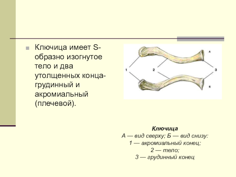 Слайд 5Ключица имеет S-образно изогнутое тело и два утолщенных конца-грудинный и акромиальный(плечевой).