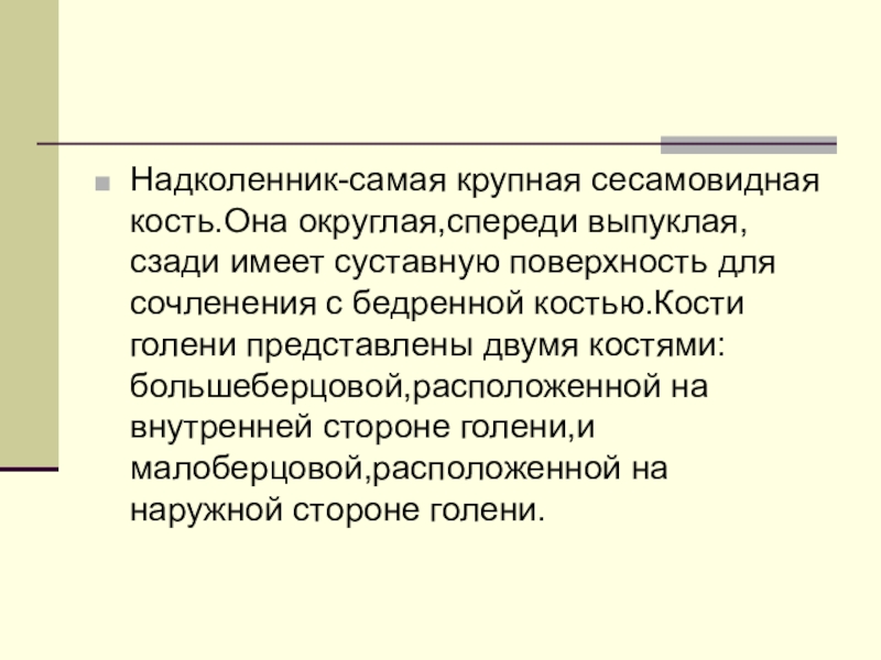 Слайд 31Надколенник-самая крупная сесамовидная кость.Она округлая,спереди выпуклая,сзади имеет суставную поверхность для сочленения