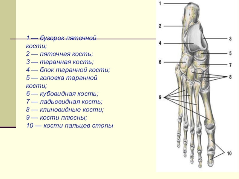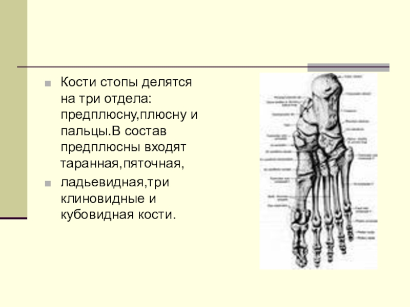 Слайд 37Кости стопы делятся на три отдела:предплюсну,плюсну и пальцы.В состав предплюсны входят