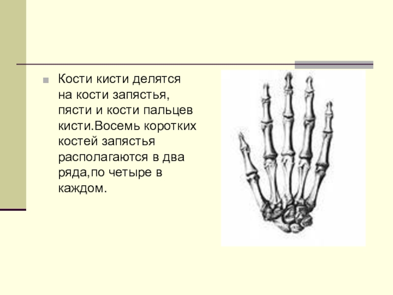 Слайд 18Кости кисти делятся на кости запястья,пясти и кости пальцев кисти.Восемь коротких