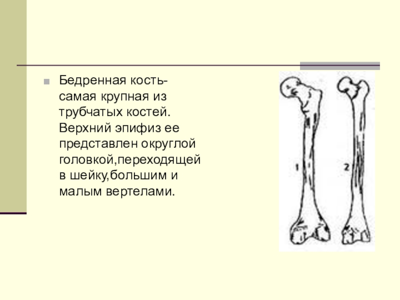 Слайд 27Бедренная кость-самая крупная из трубчатых костей.Верхний эпифиз ее представлен округлой головкой,переходящей