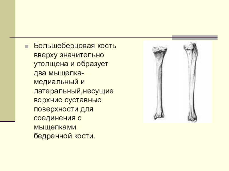 Слайд 32Большеберцовая кость вверху значительно утолщена и образует два мыщелка-медиальный и латеральный,несущие