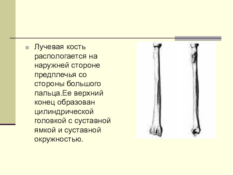 Слайд 16Лучевая кость распологается на наружней стороне предплечья со стороны большого пальца.Ее