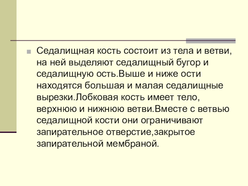 и седалищную ость.Выше и ниже ости находятся большая и малая седалищные вырезки.Лобковая кость имеет тело,верхнюю и нижнюю ветви.Вместе с ветвью седалищной кости они ограничивают запирательное отверстие,закрытое запирательной мембраной.