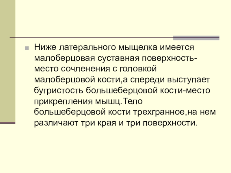 Слайд 34Ниже латерального мыщелка имеется малоберцовая суставная поверхность-место сочленения с головкой малоберцовой
