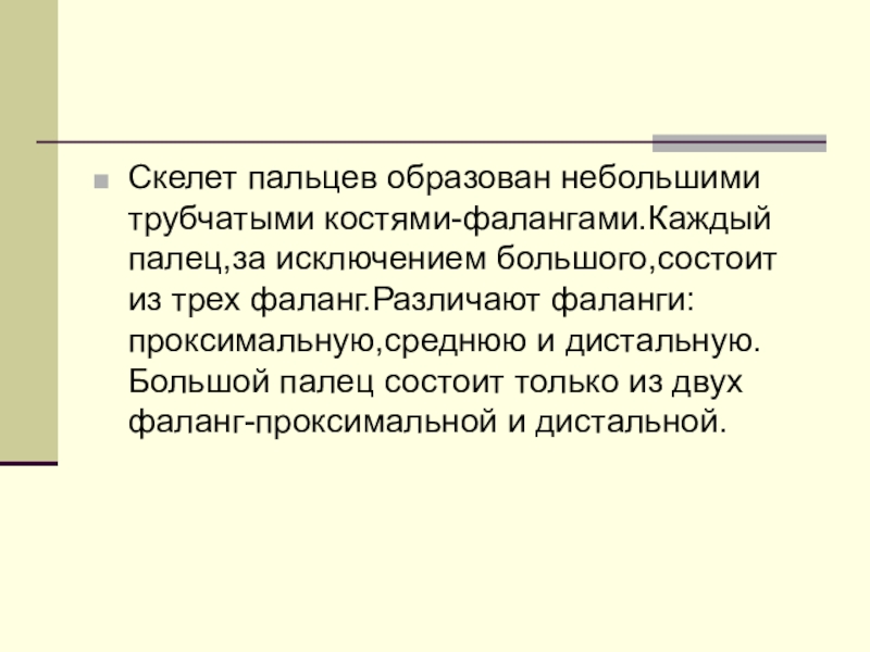 Слайд 20Скелет пальцев образован небольшими трубчатыми костями-фалангами.Каждый палец,за исключением большого,состоит из трех