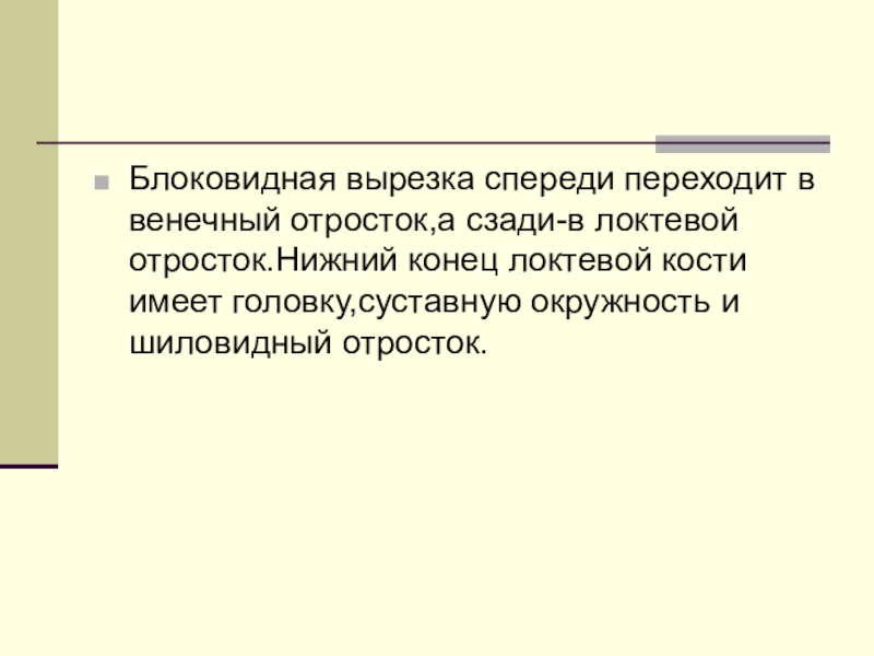 Слайд 15Блоковидная вырезка спереди переходит в венечный отросток,а сзади-в локтевой отросток.Нижний конец