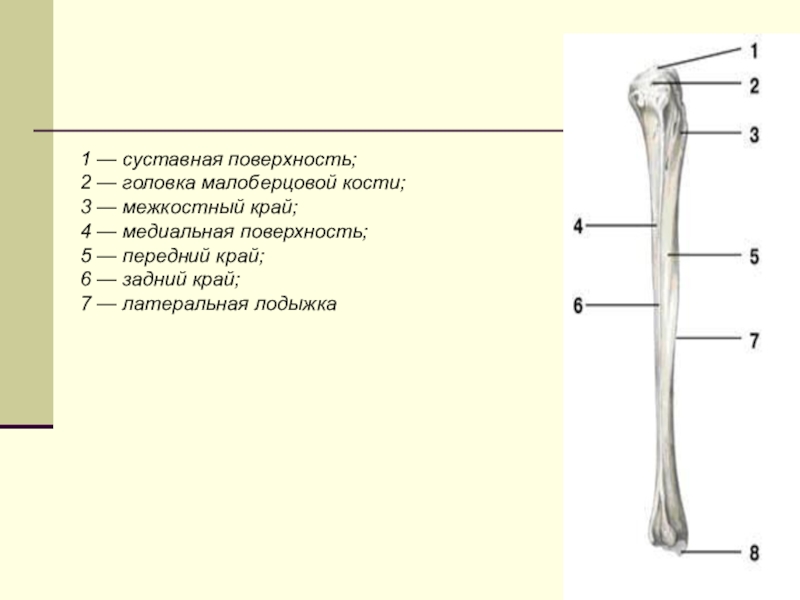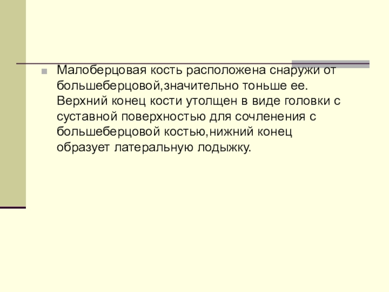Слайд 35Малоберцовая кость расположена снаружи от большеберцовой,значительно тоньше ее.Верхний конец кости утолщен