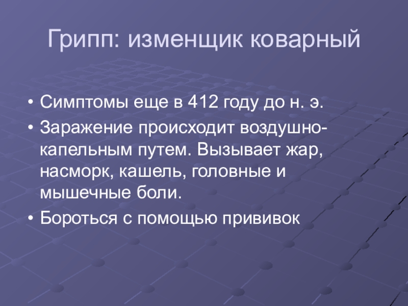 Грипп: изменщик коварныйСимптомы еще в 412 году до н. э. Заражение происходит воздушно-капельным путем. Вызывает жар, насморк,
