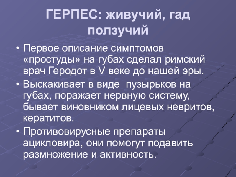 ГЕРПЕС: живучий, гад ползучий Первое описание симптомов «простуды» на губах сделал римский врач Геродот в V веке