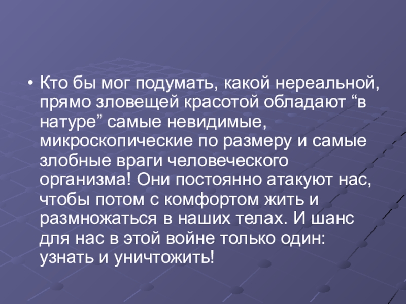 натуре” самые невидимые, микроскопические по размеру и самые злобные враги человеческого организма! Они постоянно атакуют нас, чтобы потом с комфортом жить и размножаться в наших телах. И шанс для нас в этой войне только один: узнать и уничтожить!