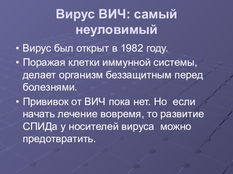 Вирус ВИЧ: самый неуловимыйВирус был открыт в 1982 году. Поражая клетки иммунной системы, делает организм беззащитным перед