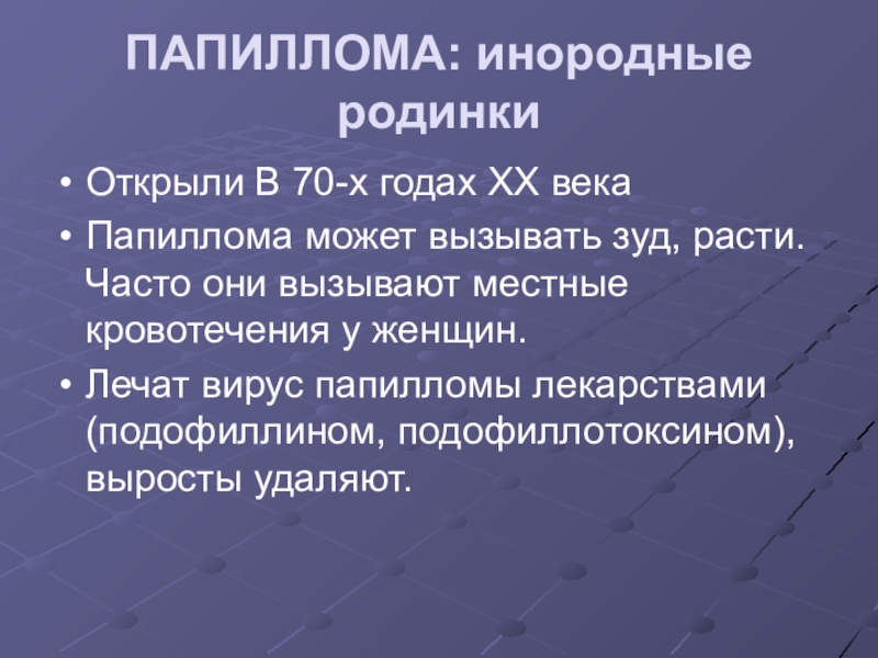 ПАПИЛЛОМА: инородные родинки Открыли В 70-х годах XX векаПапиллома может вызывать зуд, расти. Часто они вызывают местные