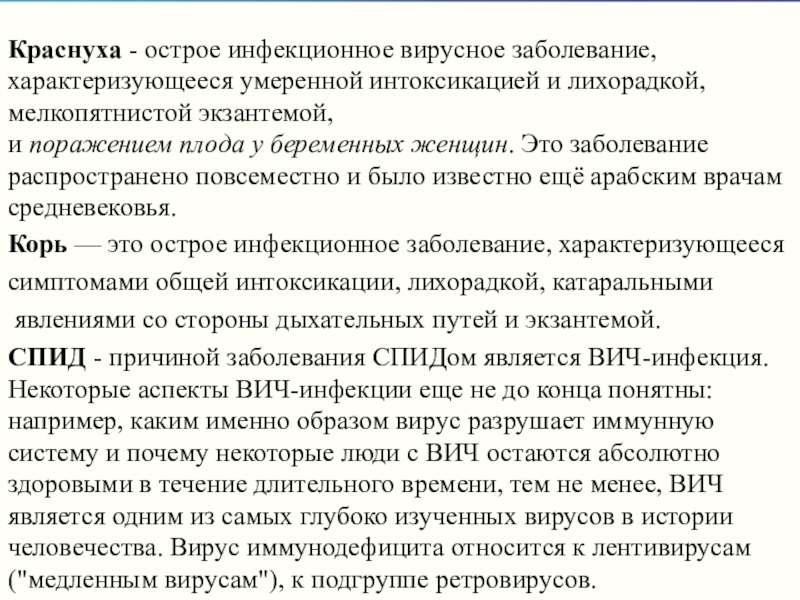 СПИД - причиной заболевания СПИДом является ВИЧ-инфекция. Некоторые аспекты ВИЧ-инфекции еще не до конца понятны: например, каким именно образом вирус разрушает иммунную систему и почему некоторые люди с ВИЧ остаются абсолютно здоровыми в течение длительного времени, тем не менее, ВИЧ является одним из самых глубоко изученных вирусов в истории человечества. Вирус иммунодефицита относится к лентивирусам ("медленным вирусам"), к подгруппе ретровирусов.