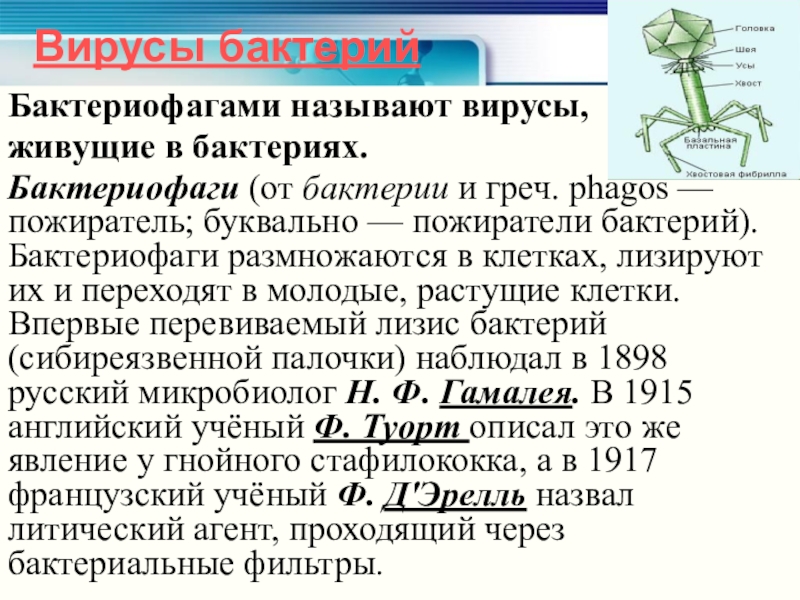 греч. phagos — пожиратель; буквально — пожиратели бактерий). Бактериофаги размножаются в клетках, лизируют их и переходят в молодые, растущие клетки. Впервые перевиваемый лизис бактерий (сибиреязвенной палочки) наблюдал в 1898 русский микробиолог Н. Ф. Гамалея. В 1915 английский учёный Ф. Туорт описал это же явление у гнойного стафилококка, а в 1917 французский учёный Ф. Д'Эрелль назвал литический агент, проходящий через бактериальные фильтры.