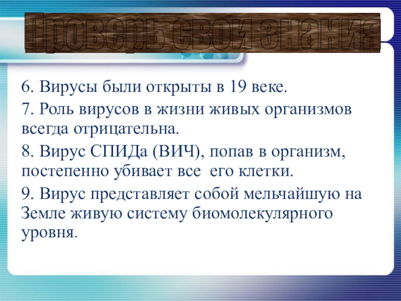 8. Вирус СПИДа (ВИЧ), попав в организм, постепенно убивает все его клетки.