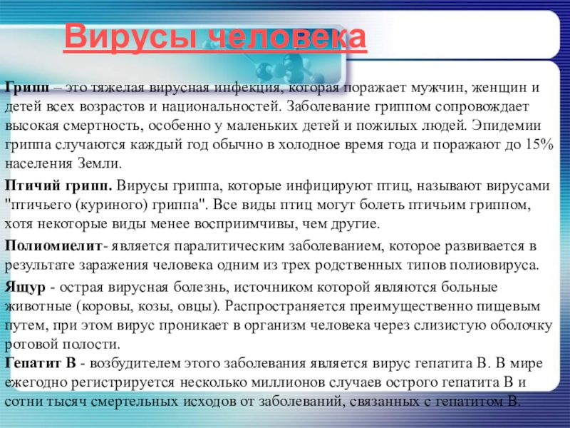 и детей всех возрастов и национальностей. Заболевание гриппом сопровождает высокая смертность, особенно у маленьких детей и пожилых людей. Эпидемии гриппа случаются каждый год обычно в холодное время года и поражают до 15% населения Земли.