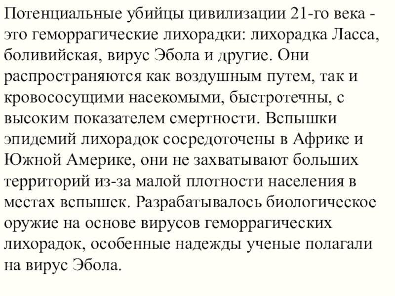 Слайд 28Потенциальные убийцы цивилизации 21-го века - это геморрагические лихорадки: лихорадка Ласса,