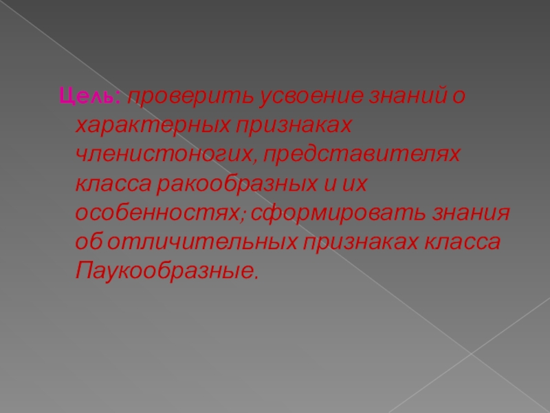 Слайд 6 Цель: проверить усвоение знаний о характерных признаках членистоногих, представителях класса