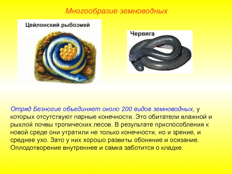 парные конечности. Это обитатели влажной и рыхлой почвы тропических лесов. В результате приспособления к новой среде они утратили не только конечности, но и зрение, и среднее ухо. Зато у них хорошо развиты обоняние и осязание. Оплодотворение внутреннее и самка заботится о кладке.