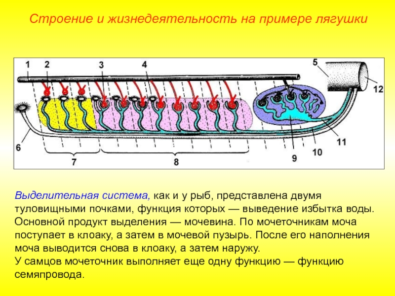Слайд 30Выделительная система, как и у рыб, представлена двумя туловищными почками, функция