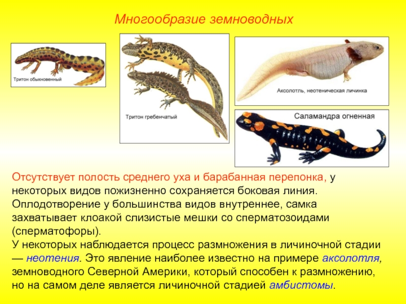 пожизненно сохраняется боковая линия. Оплодотворение у большинства видов внутреннее, самка захватывает клоакой слизистые мешки со сперматозоидами (сперматофоры).