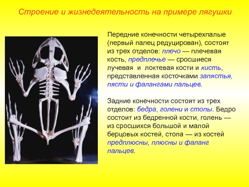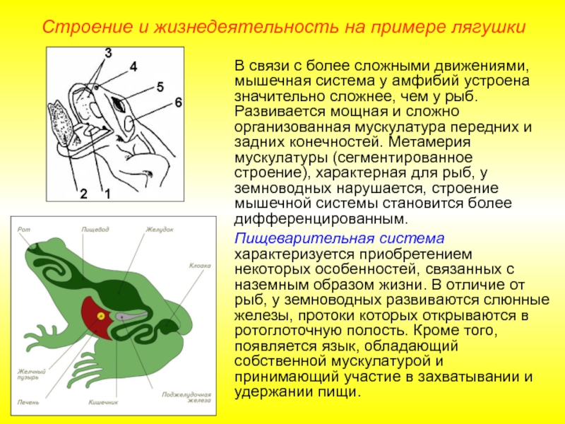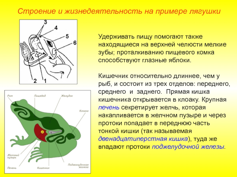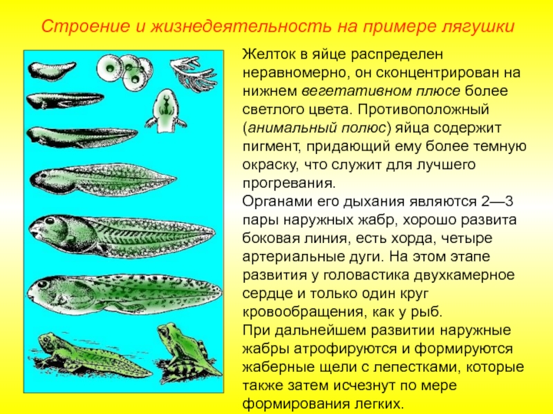 Слайд 13Строение и жизнедеятельность на примере лягушки