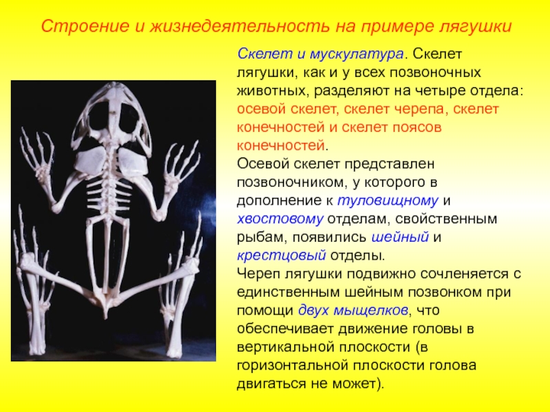 Череп лягушки подвижно сочленяется с единственным шейным позвонком при помощи двух мыщелков, что обеспечивает движение головы в вертикальной плоскости (в горизонтальной плоскости голова двигаться не может).