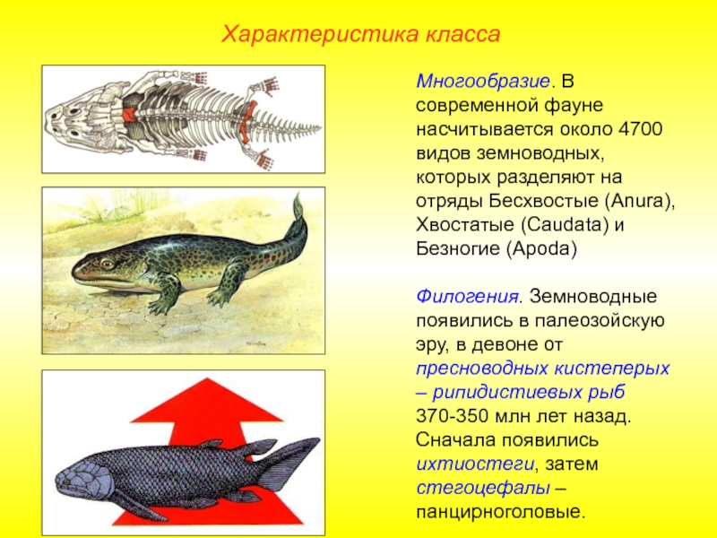 Филогения. Земноводные появились в палеозойскую эру, в девоне от пресноводных кистеперых – рипидистиевых рыб 370-350 млн лет назад. Сначала появились ихтиостеги, затем стегоцефалы – панцирноголовые.