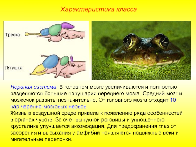 Слайд 26Нервная система и органы чувств. У амфибий увеличились относительные размеры переднего