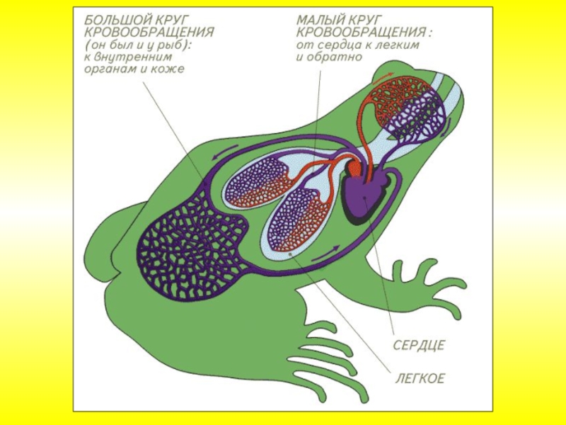 Усложнилась кровеносная система, развился легочный круг кровообращения, т. е. у амфибий два круга кровообращения — большой и малый. Сердце стало трехкамерным.