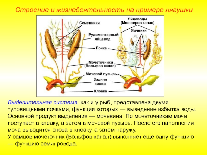 Слайд 31Выделительная система, как и у рыб, представлена двумя туловищными почками, функция