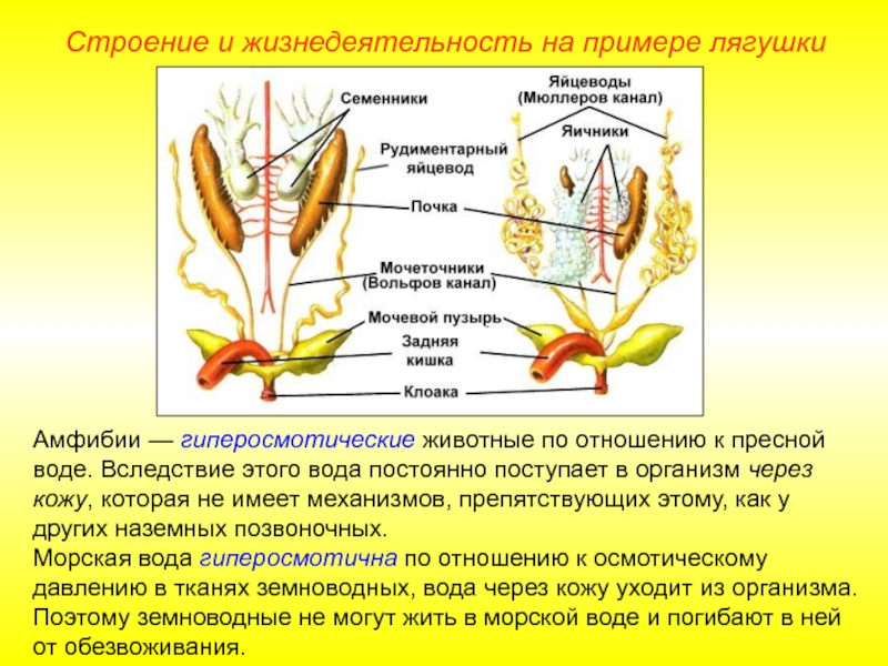 Слайд 32Амфибии — гиперосмотические животные по отношению к пресной воде. Вследствие этого