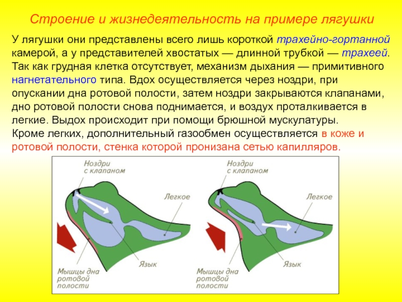 представителей хвостатых — длинной трубкой — трахеей. Так как грудная клетка отсутствует, механизм дыхания — примитивного нагнетательного типа. Вдох осуществляется через ноздри, при опускании дна ротовой полости, затем ноздри закрываются клапанами, дно ротовой полости снова поднимается, и воздух проталкивается в легкие. Выдох происходит при помощи брюшной мускулатуры.