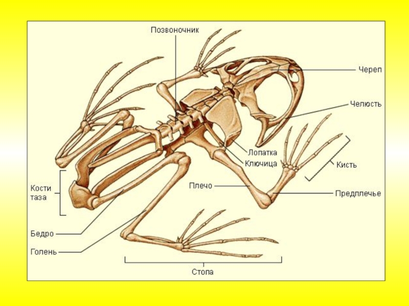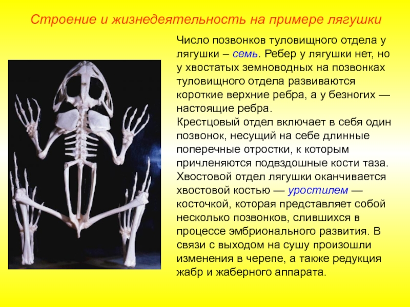 Хвостовой отдел лягушки оканчивается хвостовой костью — уростилем — косточкой, которая представляет собой несколько позвонков, слившихся в процессе эмбрионального развития. В связи с выходом на сушу произошли изменения в черепе, а также редукция жабр и жаберного аппарата.